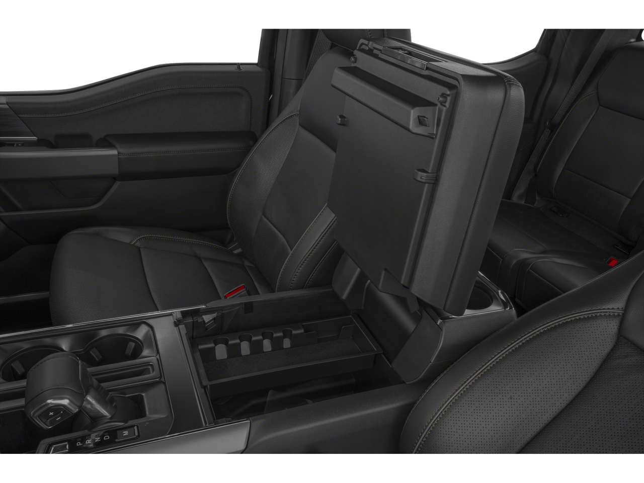 Step inside the cabin, and you'll be greeted by a world of comfort and convenience. The leather-trimmed bucket seats with heating and ventilation keep you comfortable in any weather, while the wireless charging pad and console worksurface turn your F-150 into a mobile office.
